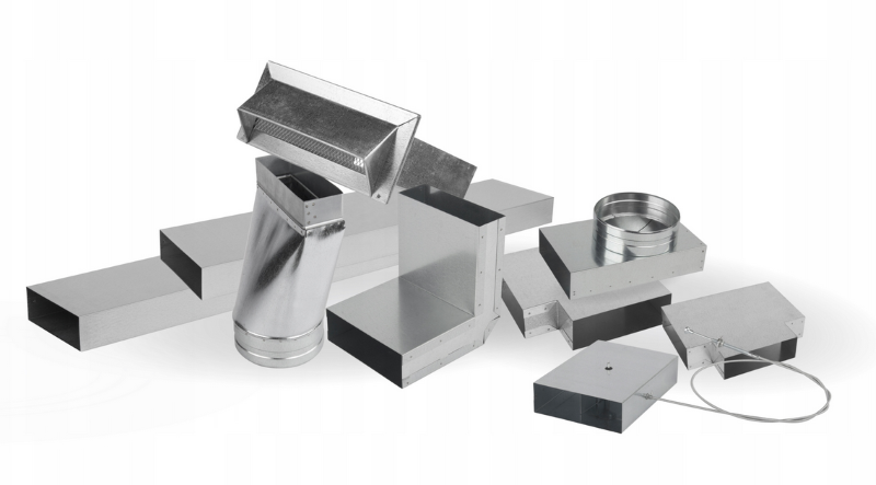 Elementy te produkowane są z blachy ocynkowanej o grubości 0,5 mm. Wszystkie elementy wykonywane są metodą zgrzewania punktowego. Elementy łączone są ze sobą przy pomocy złączek na które nachodzą elementy. Zakres kształtów produkowanych elementów daje pełne możliwości skompletowania odpowiednich systemów, w zależności od indywidualnych potrzeb. Kształtki prostokątne pozwalają na wykonanie nawet najbardziej skomplikowanych instalacji.