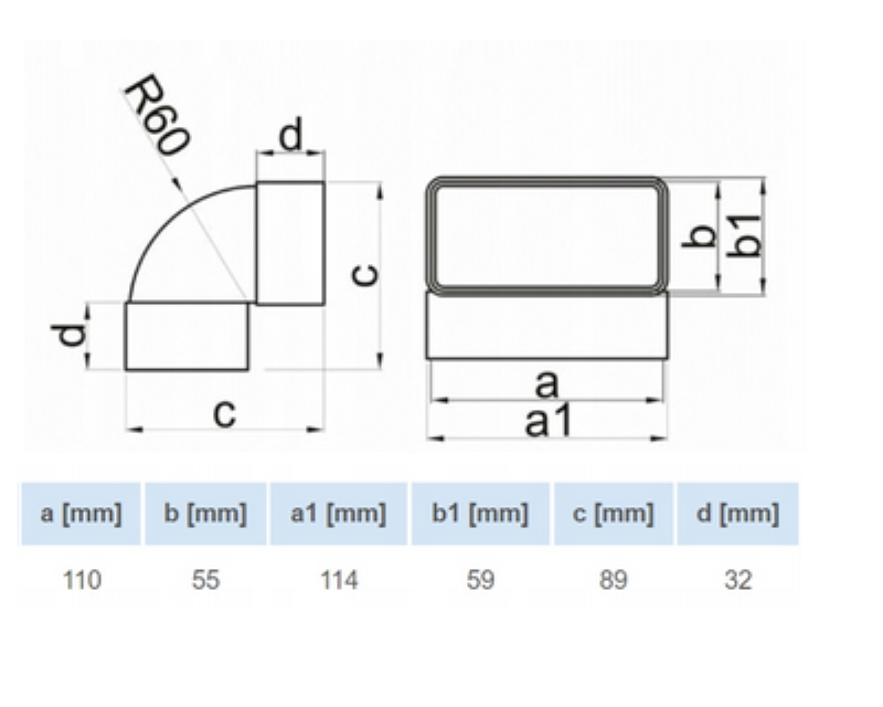 KOLANO WENTYLACYJNE PIONOWE 90 ST. DO KANAŁU 110x55mm VENTS 060