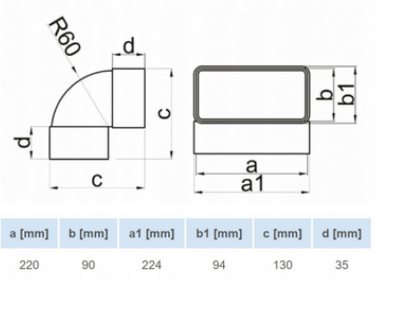 szt.KOLANO WENTYLACYJNE PŁASKIE STAŁE ŁĄCZĄCE KANAŁ 220x90mm Z FI125 VENTS 951-1