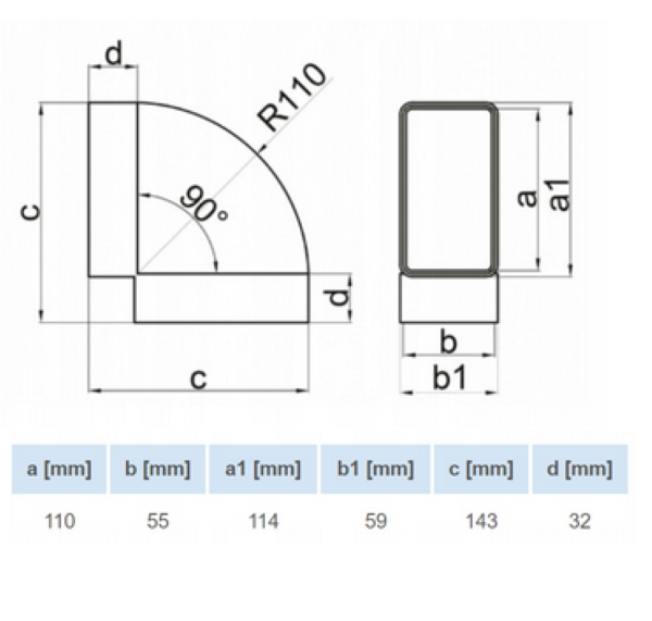 KOLANO WENTYLACYJNE POZIOME 90 ST. DO KANAŁU 110x55mm VENTS 050