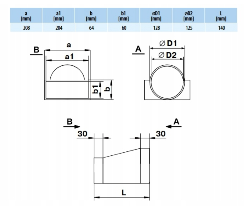 ŁĄCZNIK PRZEKROJÓW REDUKCJA KANAŁU PŁASKIEGO 204x60mm DO FI125mm VENTS 570