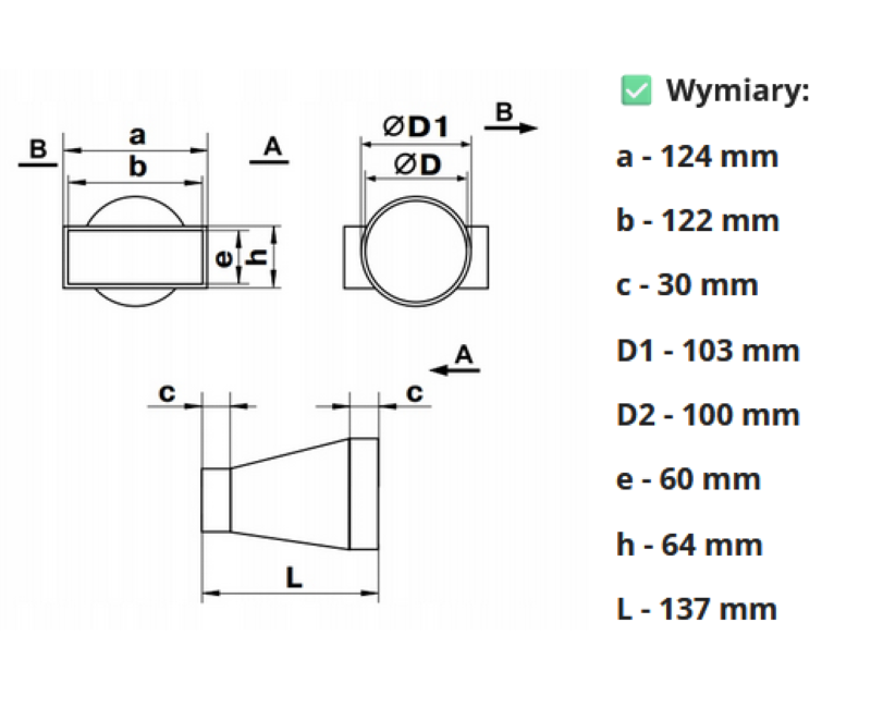 ŁĄCZNIK PRZEKROJÓW ZMIENNYCH KANAŁU PŁASKIEGO 120x60mm NA KANAŁ FI100mm WSPÓŁOSIOWO VENTS