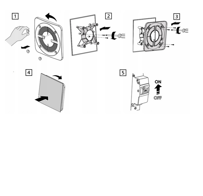 5️⃣ Zamontować wentylator za pomocą wkrętów. Podłączyć wentylator do sieci zasilającej zgodnie ze schematem połączeń.