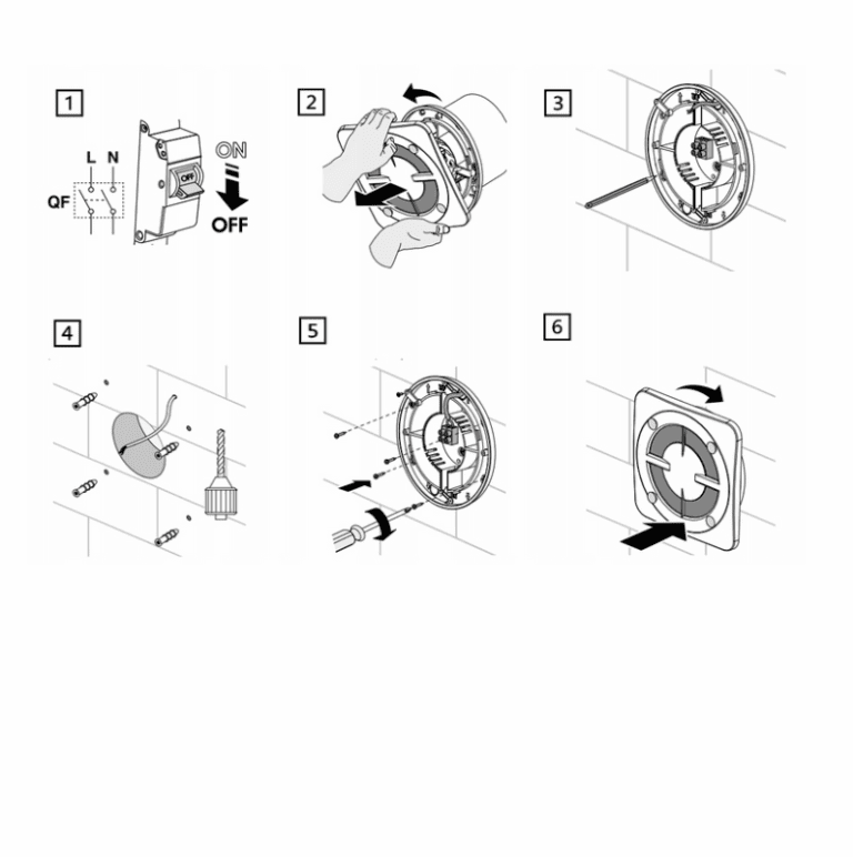 5️⃣ Zamontować wentylator za pomocą wkrętów. Podłączyć wentylator do sieci zasilającej zgodnie ze schematem połączeń.