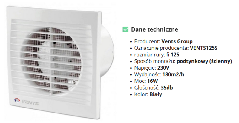 WENTYLATOR ŁAZIENKOWY DOMOWY FI 125mm STANDARD WYDAJNY 185m3/h MOC 16W