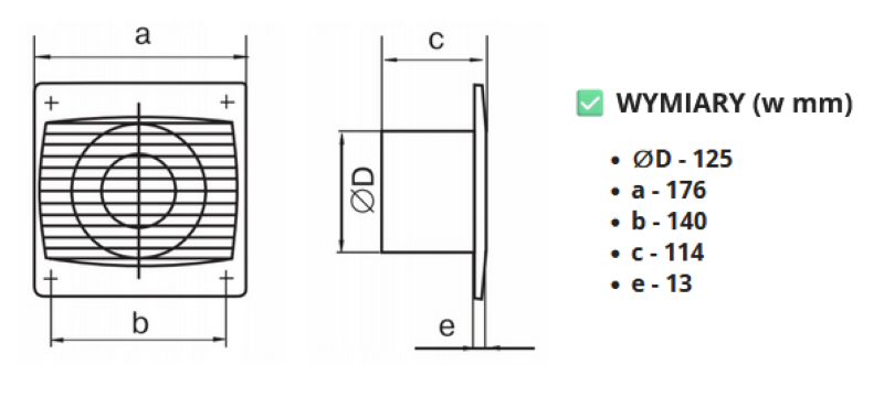 - Króciec wylotowy pozwala wmontować wentylator w ciąg wentylacyjny lub przyłączyć do kanału wentylacyjnego Ø 125 mm.
