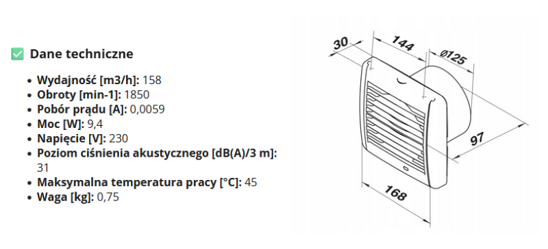 WENTYLATOR ŁAZIENKOWY DOMOWY OSIOWY FI125mm STANDARD CICHY 31dB SILENT