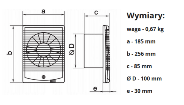 - Wentylator osiowy, plastikowy, domowy, preferowany montaż ścienny lub opcjonalnie sufitowy