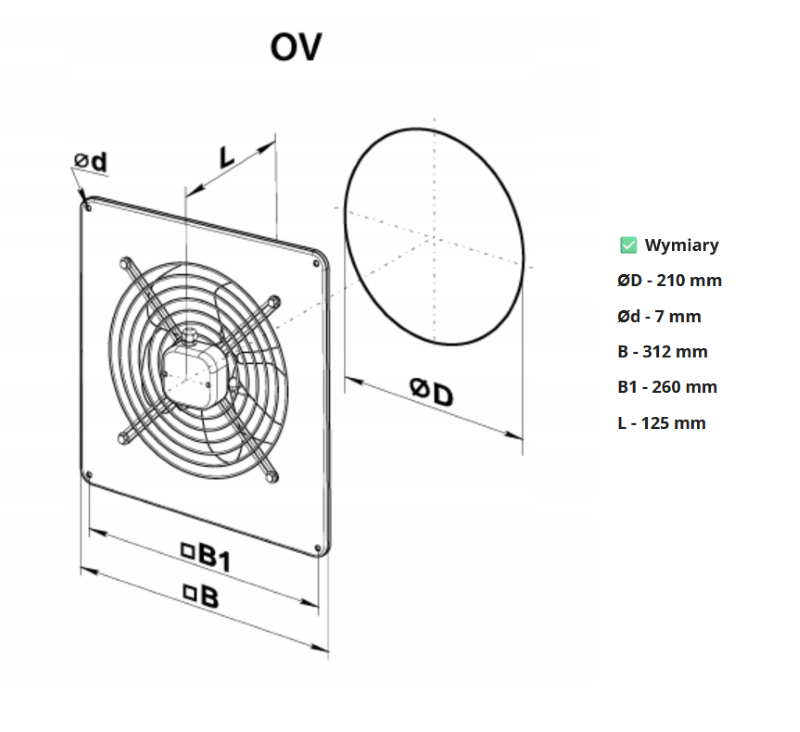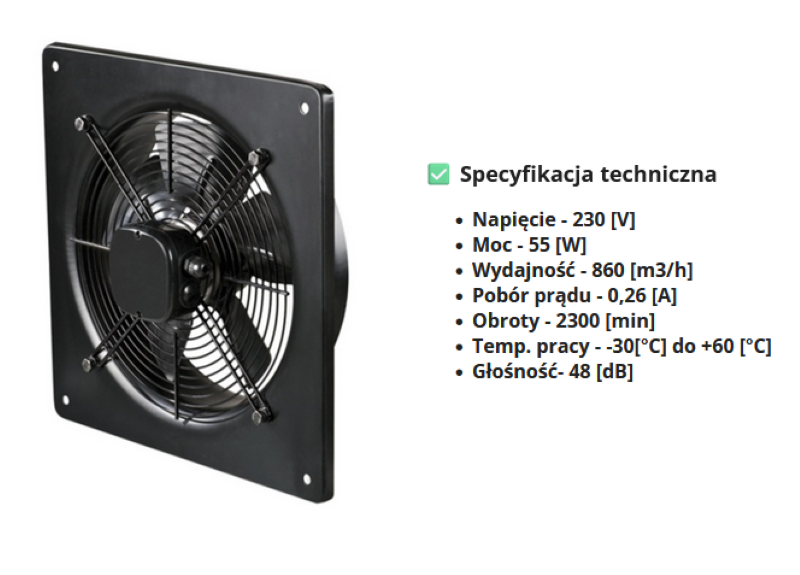 - Trwała konstrukcja: Obudowa oraz wirnik skrzydełkowy wykonane są z blachy stalowej z powłoką polimerową, co zapewnia odporność na czynniki zewnętrzne i korozję