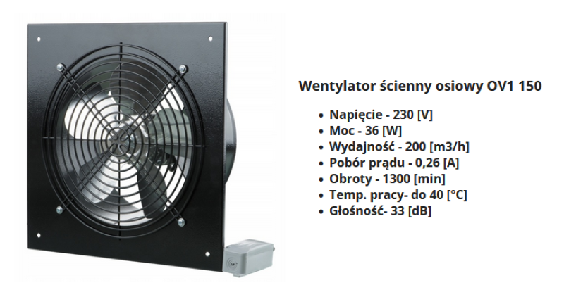 Obudowy wentylatora OV1 wykonana jest z blachy stalowej z powłoką polimerową. Wirnik skrzydełkowy wykonany jest z blachy aluminiowej.