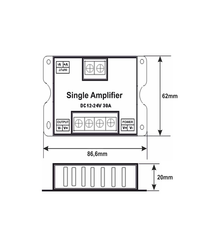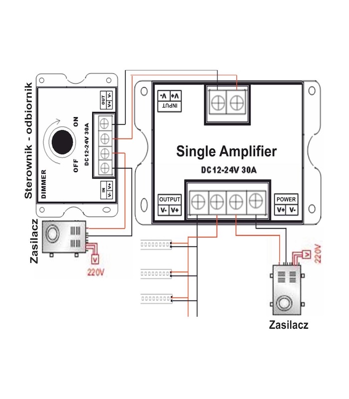 Wzmacniacze sygnału do taśm jednokolorowych LED stosowane są gdy łączny pobór taśmy LED przekracza maksymalną moc wyjściową danego ściemniacz lub odbiornika LED. Urządzenie może współpracować z innymi wzmacniaczami, dzięki takiemu zestawowi jesteśmy wstanie stworzyć dowolnej długości odcinki taśmy jednokolorowej. Zestaw taki obsługiwany będzie jednym ściemniaczem lub odbiornikiem LED. Łatwy w instalacji i prosty w obsłudze.