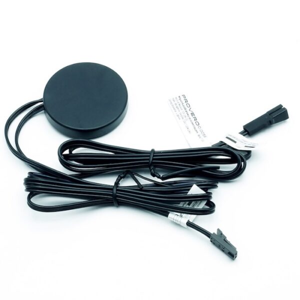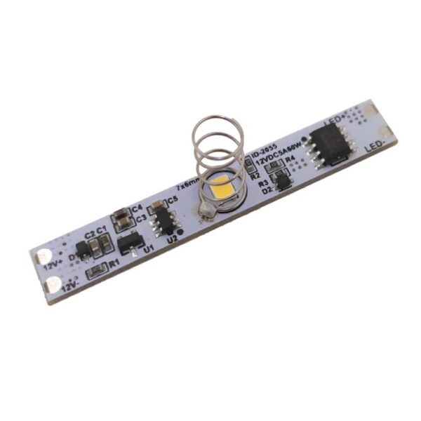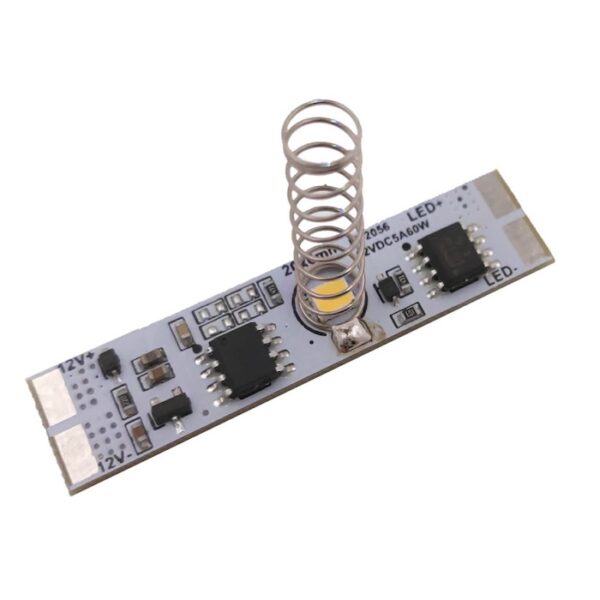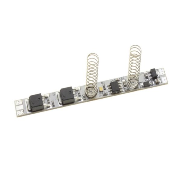 Włącznik bezdotykowy ma formę płytki drukowanej (PCB) o wymiarach 8x54mm umożliwiających umieszczenie w profilu aluminiowym między taśmą LED a zasilaczem. Wlutowana sprężynka o wysokości kilku cm powinna być osłonięta kloszem profilu i stanowi punkt maksymalnej czułości układu. Płytka ma pole stykowe umożliwiające lutowanie przewodów połączeniowych. |